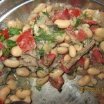 Чеснок мелко рубим, смешиваем его с винным уксусом, оливковым маслом, солью и перцем. Добавляем фасоль, хорошенько перемешиваем и оставляем мариноваться (лучше минут на 30).