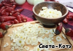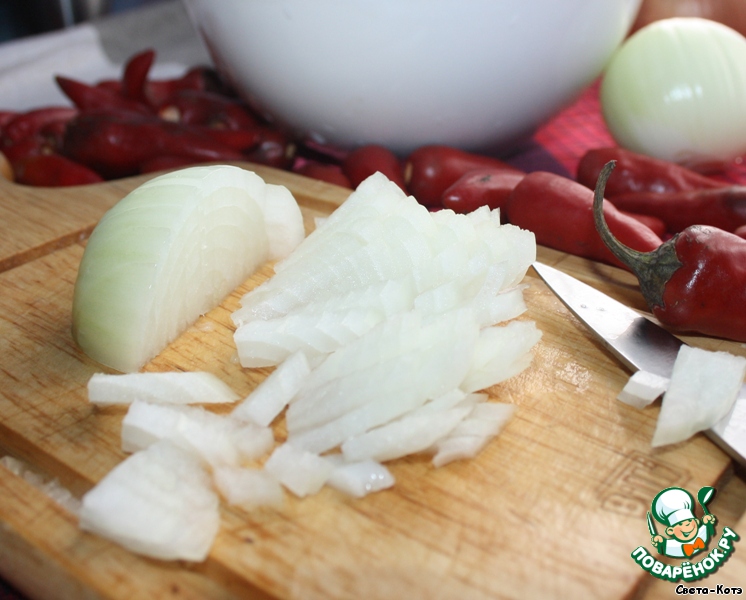 Перец режем кольцами (семена удалять не обязательно)! Будьте осторожны, берегите кожу рук – используйте перчатки.
