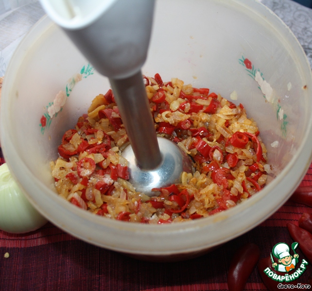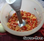Получившуюся массу выкладываем в емкость и перемалываем в блендере.