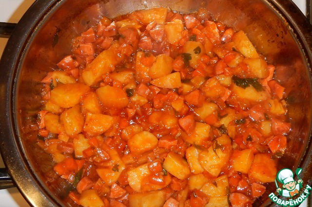 Когда картофель сварится, добавить его вместе с водой, в которой он варился, в сковороду. Перемешать и тушить еще минуты 3.
