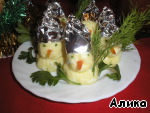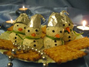 Носы из моркови или сладкого перца, шарфики – из перьев лука. Шапочки делаем из фольги или можно использовать обертки от конфет ассорти.