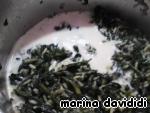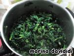 Тщательно промываем шпинат, отрезаем ножку, солим и мнем, чтобы вышел сок. В кастрюле слегка обжариваем крупно нарезанный лук на оливковом масле, добавляем шпинат. Тушим примерно 20 мин. Добавляем воду.