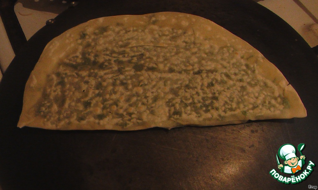 Раскатать тесто и нарезать кружочками. Положить на одну половину кружочка зелень, накрыть второй половиной и завернуть в форме полумесяца.