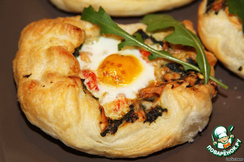 Поставить в духовку на 10 минут, подождать, пока тесто поднимется. Влить на каждую слойку по перепелиному яйцу и отправить в духовку на 5-7 минут.