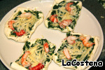 Разрезать тесто на прямоугольники, посыпать тертым сыром и выложить 3-4 раковых шейки. Завернуть края немного внутрь.