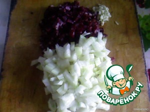 Нарезать колбасу небольшими кубиками, лук и чеснок нарезать мелко.