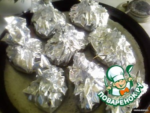 • Из фольги вырезать квадраты. На каждый квадрат налить немножко растительного масла и положить курицу.