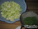 • Капусту нарезаем квадратами. Горох промываем в воде.