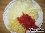• Лук, чеснок, помидоры и имбирный корень мелко нарезаем.