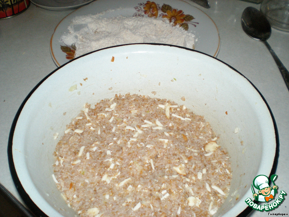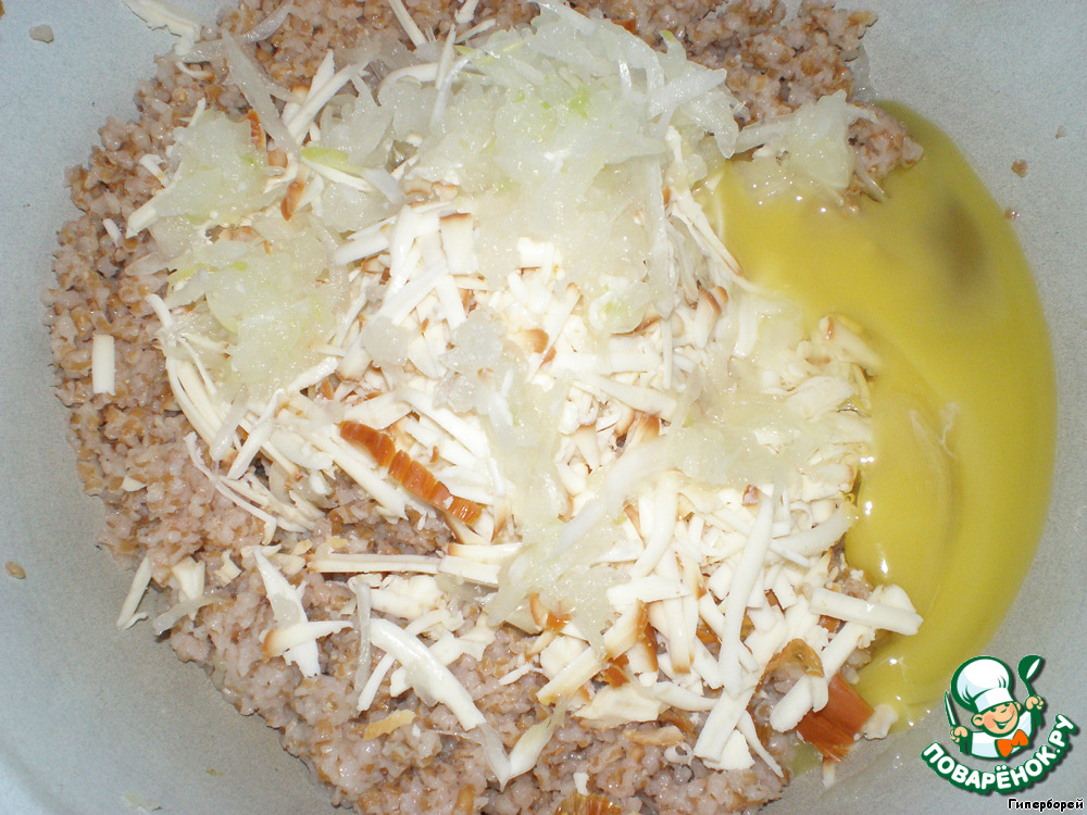 Сваренную в подсоленной воде пшеничную кашу охладить. Добавить натертый на крупной терке лук и сыр, влить яйцо, добавить специи, посолить и хорошенько перемешать.