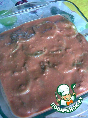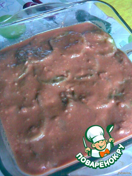 Подготовить заливку: томат. пасту смешать с мукой, солью, перцем и травами, добавить воды. Заливка должна быть густой. Залить кабачки.