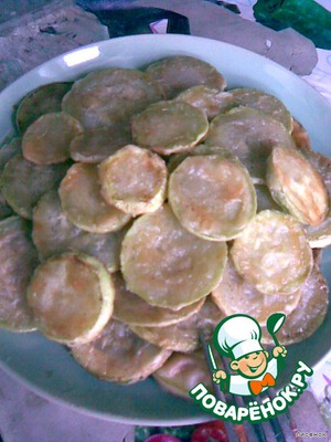 Kабачки помыть и порезать кружочками. Посолить, поперчить и оставить на 5 минут, чтоб стекла жидкость.