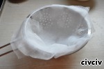 Для начала займемся кремом. Крем, как вы догадались, будет сметанным. Он придаст приятную кислинку ароматным медовым коржам. Но чтобы наша сметана не потекла, когда мы добавим в нее сахар, и чтобы не пользоваться загустителями, мы сметану немного отцедим. Для этого нужен дуршлаг и марля в два слоя. Моя марля куда-то задевалась, поэтому пришлось проложить широкий бинт.