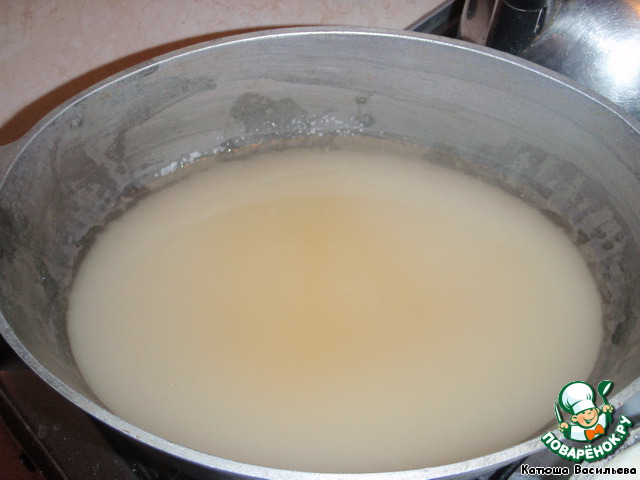 В кастрюлю, желательно широкую, высыпаем сахар, добавляем воду и ставим на огонь, после закипания даем сиропу провариться минут 5-8 на среднем огне.