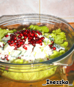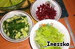 Нарезаем огурец, салат, очищаем гранат и по отдельности заправляем маслом (дабы не перемешались цвета). Маленькую горсть граната оставляем для посыпки.