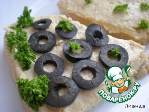 Смесь получается густая, поэтому необходимо добавить майонез, чтобы придать необходимую консистенцию паштету. Конечно, майонез нужно брать домашний. Можно добавить и маслины, потом еще раз взбить блендером. Но у меня дочь их не любит, поэтому я просто нарезала колечками маслины и уложила их на готовый бутерброд. Паштет при необходимости досолить и …