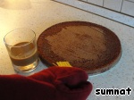 8. Поместите корж обратно в форму с бортиками и залейте получившимся кремом (будьте внимательны – если дно неплотно прилегает к бортам, часть крема может просочиться. Можно избежать этого, плотно обернув корж по периметру бумагой. Я использую пергамент, сложенный по длине трижды). Уберите форму в холодильник на 2-3 часа (если, конечно, у вас в хозяйстве не найдется Деда Мороза с арктическим дыханием