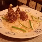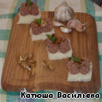 Перед подачей на стол фольга разворачивается, рулет нарезается ломтиками толщиной сантиметра в полтора, и выкладывается на блюдо.. белое масло в серединке и розоватая масса паштета выглядит довольно аппетитно. Далее можно украшать как кому нравится - красный гранат, свежая кинза, грецкие орехи... конечно, закуска такая не на каждый день, т.к. весьма калорийна, да и времени на приготовление отнимает дай бог. Но гостям, ценящим армянскую и грузинску кухню, должно понравиться.