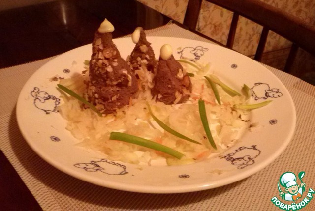 [+5]орехов грецких не было, посыпала арахисом, а сверху вместо снега майонез, сугробы были из капусты квашеной