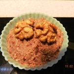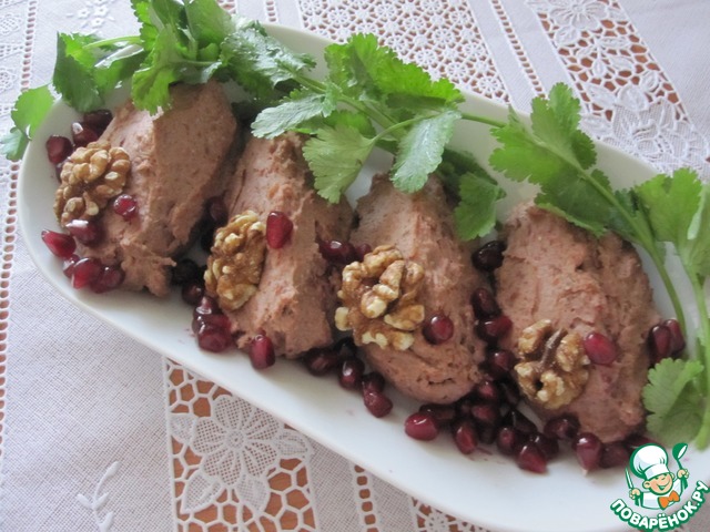 Вариант №2. Можно к процессу готовки подключить подрастающее поколение и дать команду накрутить шарики, конусы, затем обвалять их в растолченных грецких орехах. Добавленные зёрна граната, кинза только подчеркнут вкус паштета, придадут кавказский колорит.