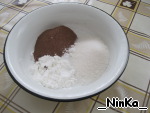 В миске смешиваем сахар, какао-порошок и крахмал.