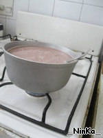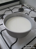 В отдельной кастрюле смешиваем 0.5 л воды и 0.5 л молока, ставим на огонь, подогреваем, но не доводим до кипения.