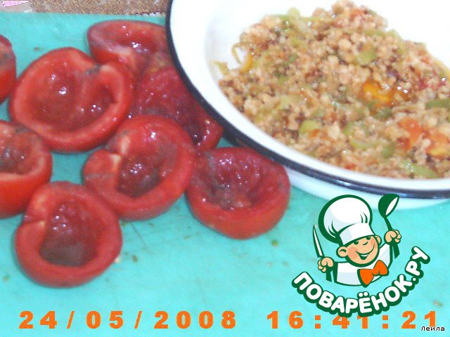Помидоры разрезать, вынуть мякоть. Посолить, поперчить.