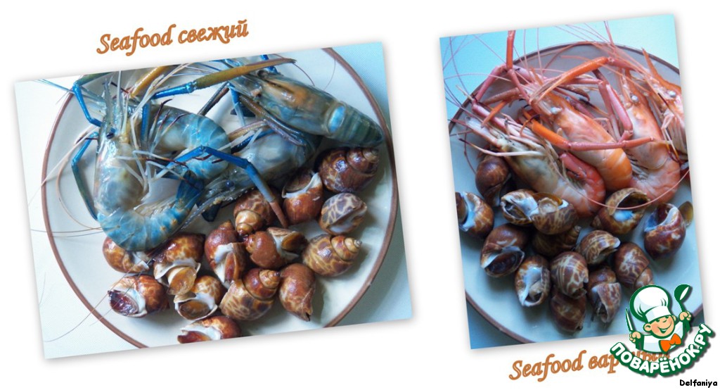 Морепродукты. Можно взять любые. Хоть готовый варено-мороженый морской коктейль. Кстати, имейте в виду, что замороженные морепродукты чаще всего уже слегка сварены, а уже потом только заморожены (это обычно указано на упаковке). Этим объясняется розовый цвет большинства креветок. В изначальном своем состоянии большинство видов синеватые, как у меня на фото. И только после варки розовеют.