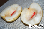 Грушу разрезать пополам, вытащить косточки ложкой, сбрызгнуть соком лимона и положить малюсенький кусочек перца.