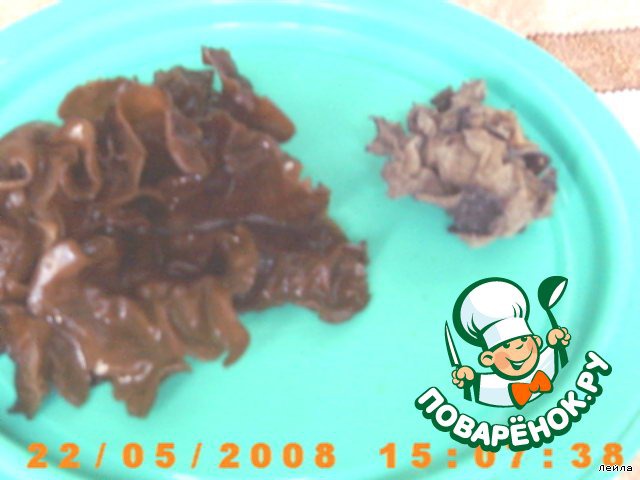 • Гриб этот замачивают крутым кипятком, на фото видно какой он маленький - сухой, и после кипятка увеличивается в 5 раз.))) Экономный гриб))
