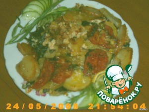• Чуть потушила грибы, отдельно пожарила лук. Разложила лук и грибы на картофель, сверху разложила еще раз картофелем. Залила соусом из яйца и сливок.