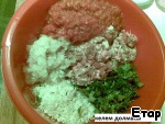 Соединить вместе фарш, рис, зелень, добавить 0,5 ст. воды, масло, соль, перец и хорошо перемешать.