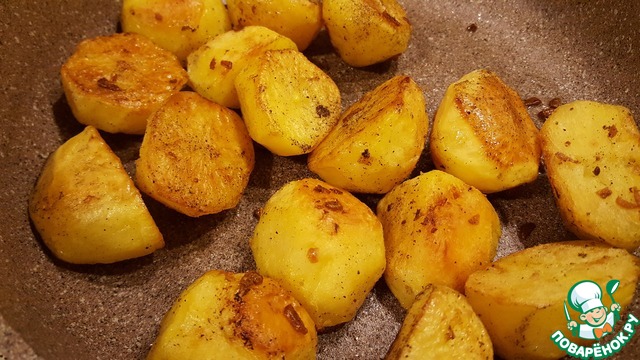 Перекладываем картошку в большую сковороду с растопленным жиром, посыпаем приправами снизу на сковороду (я добавляла розмарин и чеснок) и сверху перец.