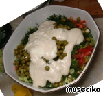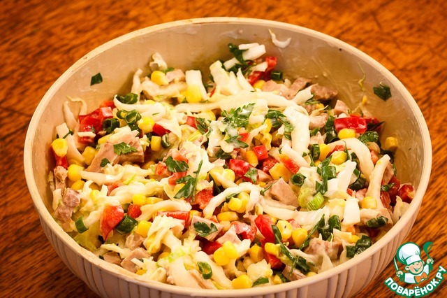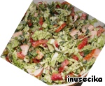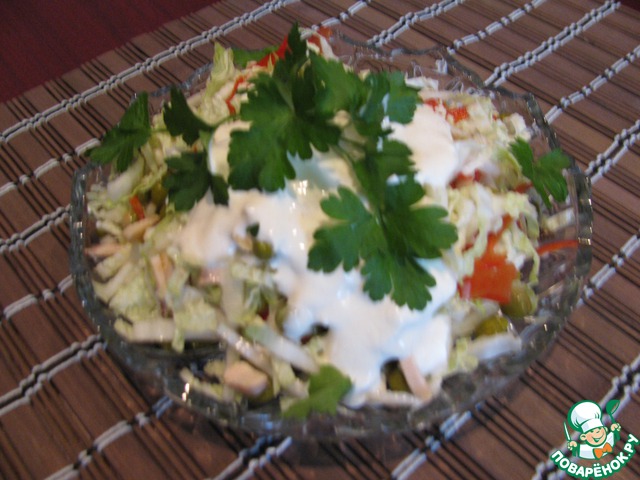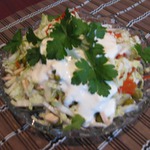 Этот салат придется по душе тем, кто борется с лишним весом, но мой муж также его полюбил. Он подойдет для легкого ланча или ужина, так как богат белком и практически нежирный. Также им можно освежить праздничное меню.