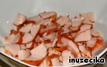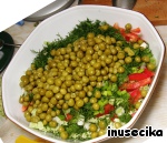 Добавить нарезанную зелень и зеленый горошек. Горошек можно заменить консервированной кукурузой.