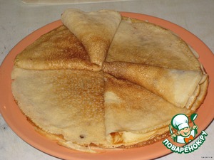 Выпечь тонкие блинчики, обжаривая с двух сторон.