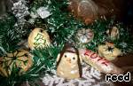 Шарики покрываем пищевой краской золотого и серебряного цвета. И наносим рисунок пищевым гелем. Им же рисуем глаза пингвинам, из кусочка цуката делаем носик.