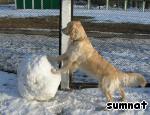 Приступили к работе с таким рвением и старанием, что даже дворовый пес Морозко захотел помочь. И вроде бы по отдельности лепили все части, что были запланированы, а в результате получился снеговик…