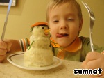 Тут как раз подошло время снимать хорошо пропеченную мясную составляющую Снежной бабы со сковороды, и Снеговик ловко подхватил ее той самой нетерпеливой лопаткой.