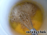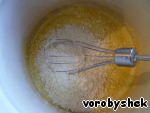Яйцо взбить с сахаром, добавить растопленный жир и протертый через сито творог.
