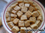 Берем глубокую форму. Советую застелить форму пищевой пленкой. Кладем на дно немного крема, затем слой наших кубиков, сверху снова крем и опять слой из кубиков.