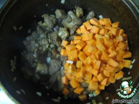 • В сотейнике нагрейте масло, обжарьте в нем мясо. Луковицы измельчите и добавьте к мясу. Обжарьте, добавьте соль и специи. К мясу положите морковь и картофель