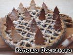 Вторую часть теста выложите на пергамент, накройте другим листом, тонко раскатайте и положите в морозилку на 5 минут. Снимите бумагу и формочками вырежьте ёлочки. Выложите на противень, выпекайте 5 минут. Остудите. Украсьте пирог ёлочками, посыпьте сахарной пудрой!!!