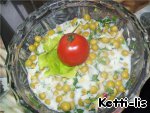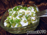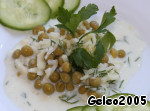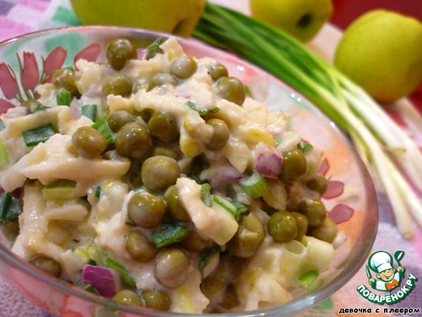 3. Горошек хорошенько отцедить от жидкости и выложить в миску. Залить кефирной заправкой. Поставить в холодильник на 20 минут. Яблоко и лук должны дать сок. После этого вынуть, добавить зелень и.. вуаля. :)