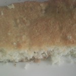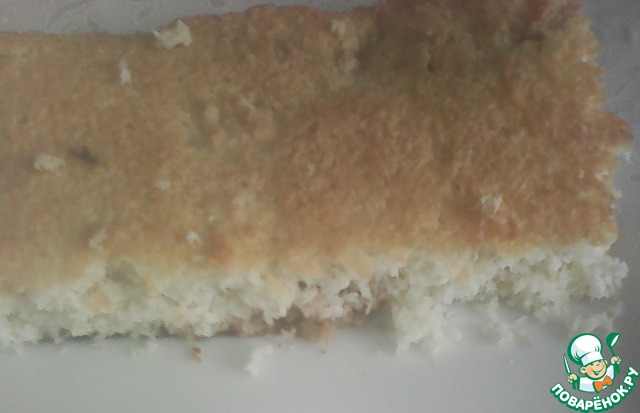 Бисквит готов. Остужаем его в духовке, потом осторожно (он довольно хрупкий) вынимаем из формы и разрезаем на два коржа. Бисквит довольно плотный и в то же время рассыпчатый, за счет кокоса. По высоте он ниже начальной высоты теста, но пусть это вас не пугает.