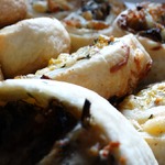 Нарезал его поперек кружочками толщиной примерно 1,5 см. и разложил их на противне, смазав взбитым яйцом. Поставил противень в холодную духовку и включил ее, выставив температуру на 200 градусов и таймер на 25 минут.
