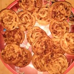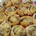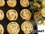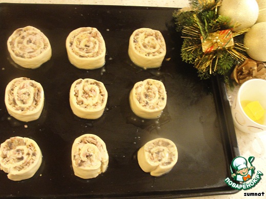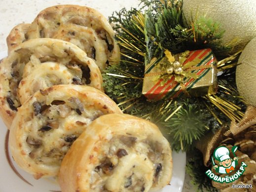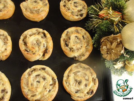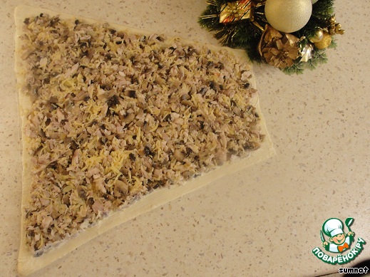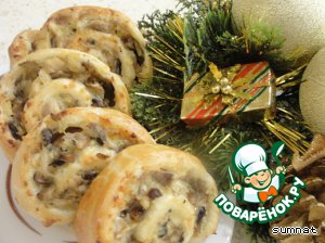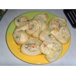 [+5]Вчера,делая запланированные дрожжевые пирожки,у меня осталось тесто.и как раз количеством на 1 ёлочку. В наличии имелись свежие кальмары и креветки(подваренные), и с ними планировалось что-то сделать,но ещё не решено что.короче они были порубленны(без фанатизма),добавленны в сметанный чесночно-укропный сыр(типа Филадэльфия)+немного муки (для загустения).и всё это было намазанно как начинка,дальше по-рецепту.укроп у меня мороженный-поэтому тёмный.для устойчивости-нанизывала "рулетики"по-типу детской пирамидки на палочку для суши.