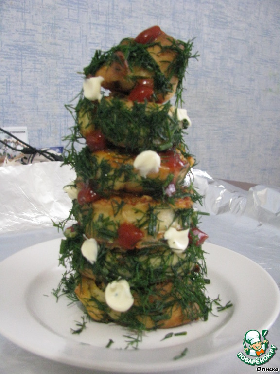 Те же манипуляции Мороз повторил с каждым кружочком, выкладывая их друг на друга по убыванию. Готовую «Елочку» украсил «гирляндами» из кетчупа и майонеза. Повернулся к подавленному Санте.