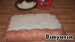 Полученный фарш выложить пластом толщиной 1,5 см на влажную марлю или пакет. Выложить приготовленные яйца в ряд. Осторожно подтягивая пакет с одной стороны, раз сворачиваем и выкладываем отварной рис и сворачиваем пласт фарша с начинкой в форме рулета. -