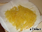Изначально в рецепте картошка была отварная, но так как мне уж очень приспичило ВСЕ нарезать тонкой соломкой, а отварная картошка ну никак не поддается такой нарезке, я взяла сырую картошку, натерла на терке для корейской моркови, промыла от крахмала и промокнула от влаги салфеткой. Обжарила до состояния готовности, но сильно не зажаривала - чтобы снаружи была зажаренной, а внутри мягкой. -